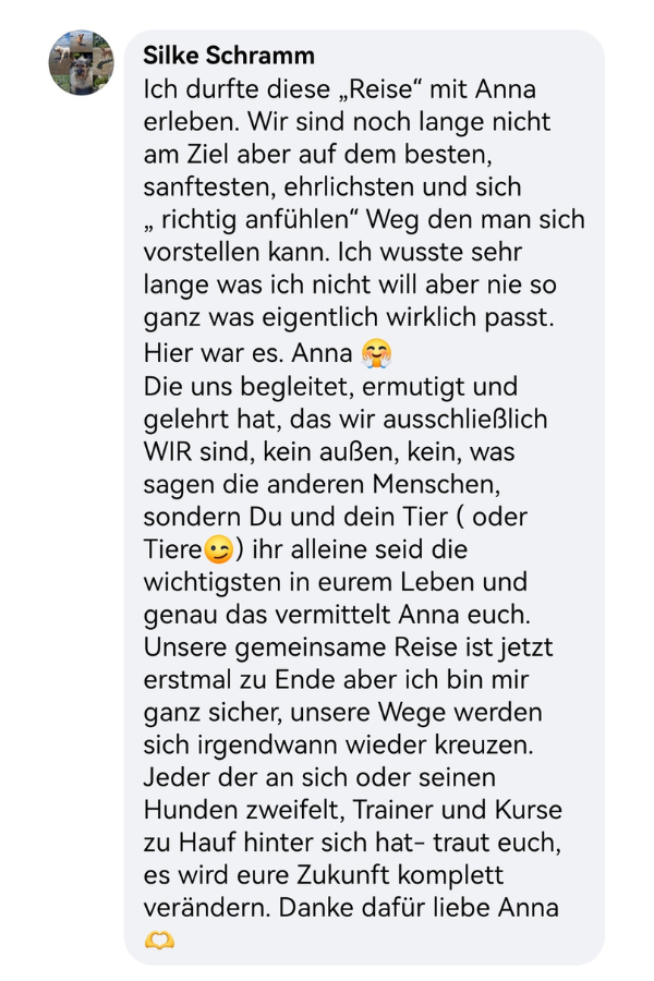 Heute begleite ich Menschen und ihre Hunde genau dabei – für mehr Verständnis, Verbindung und echte Nähe, sowie ein harmonisches und entspanntes Miteinander in allen Lebenslagen.